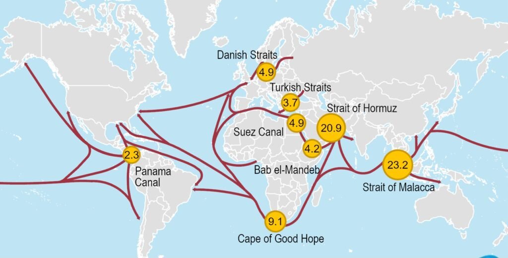 वैश्विक ऊर्जा आपूर्ति के प्रमुख समुद्री मार्ग और चोक पॉइंट्स, जहाँ होर्मुज जलडमरूमध्य का महत्व सबसे अधिक दिखाई देता है। स्रोत: U.S. Energy Information Administration (EIA)